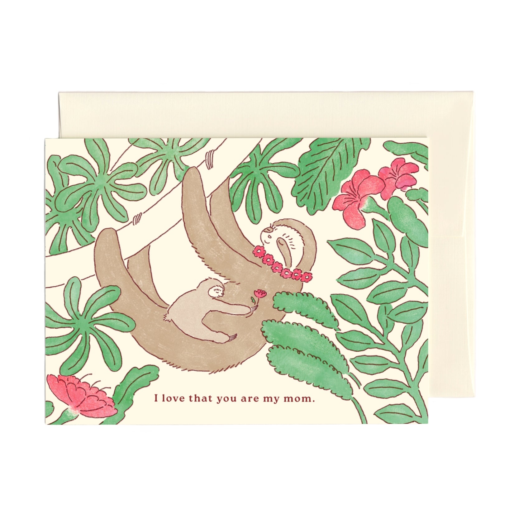 This card celebrates the feeling only a mother can give, with the peaceful illustration of a mother sloth and her baby hanging together in a tree. Perfect for Mother’s Day, birthdays, or just because.