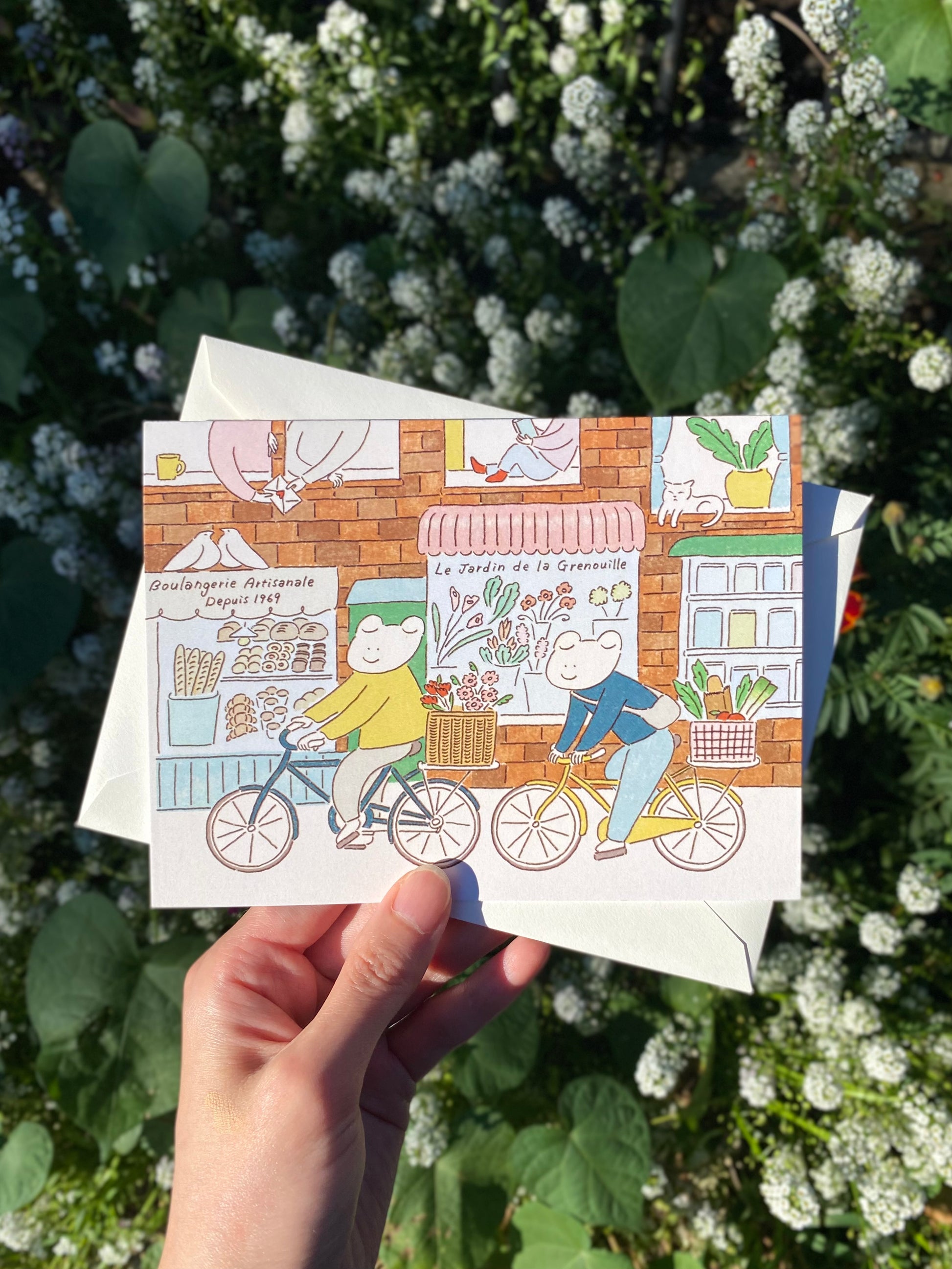 Nothing like biking around the city, picking up fresh bread and veggies with someone you love. A cozy all-occasion card, perfect just because.