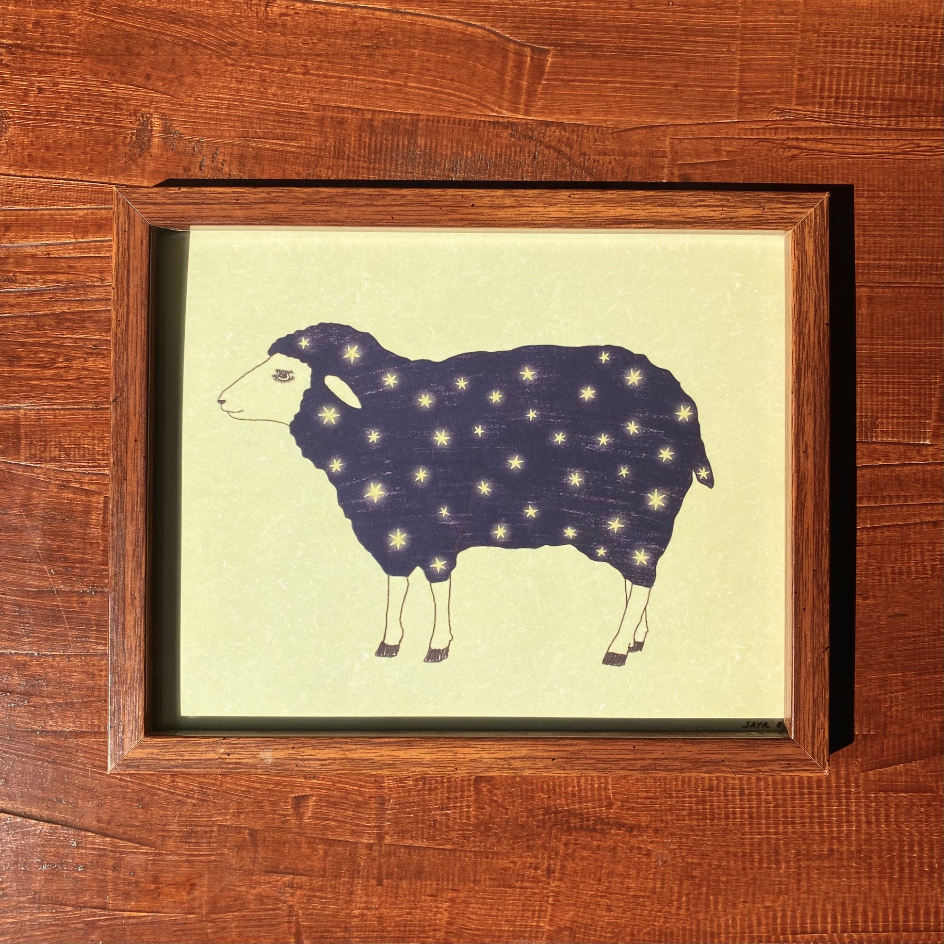 This is an illustration of a dreaming sheep that brings us to a peaceful place at the end of a long day. A perfect art print for the bed room, kids' room, or a cozy corner of the house.